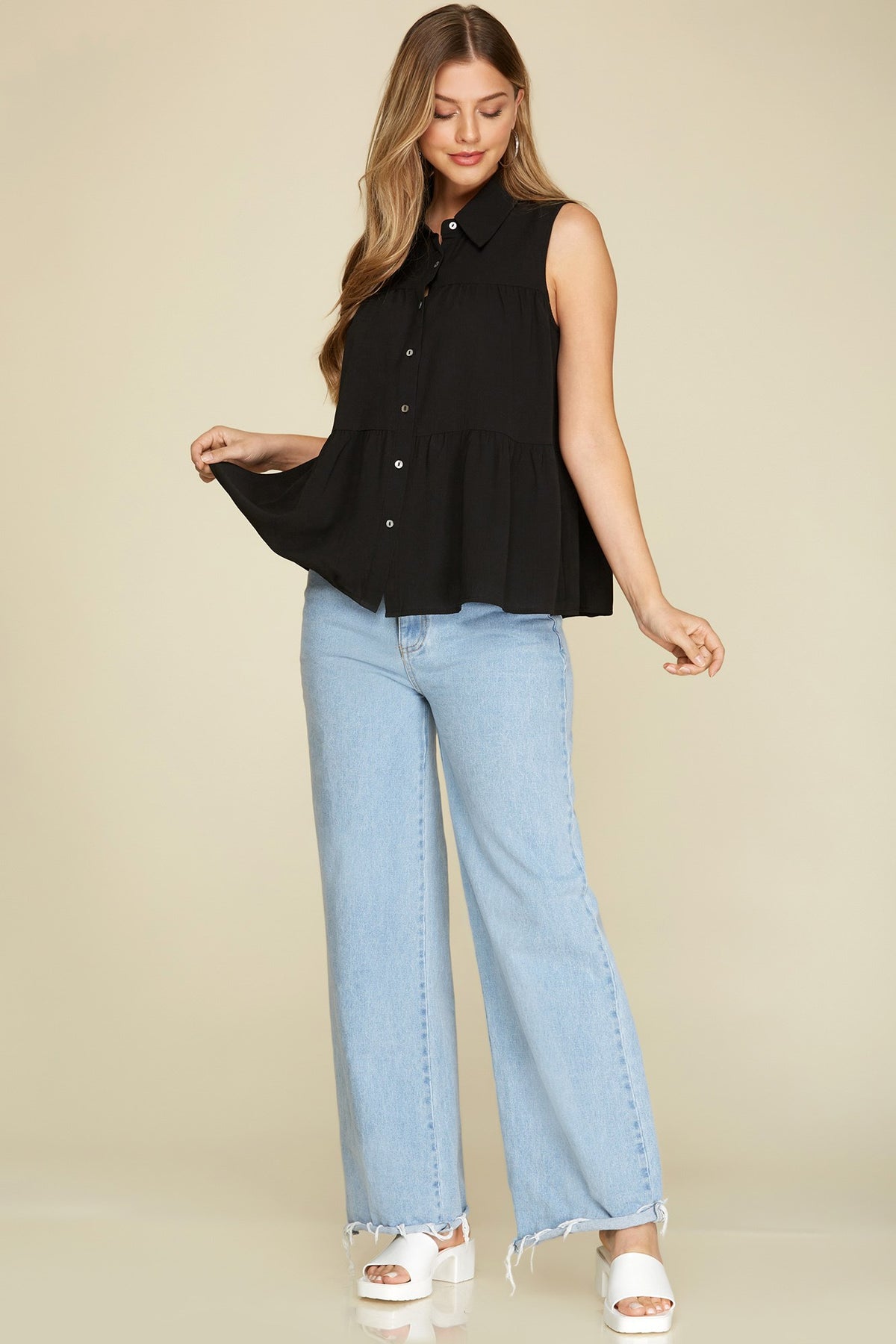 Effortless layering meets breezy style with this sleeveless woven button-down. Tiered construction adds dimension and movement, while the classic button front keeps things polished. Perfect for warm weather dressing—wear it solo over a tee, tie it at the waist, or throw it over a slip dress for instant sophistication. A versatile wardrobe essential that transitions seamlessly from casual to dressed up