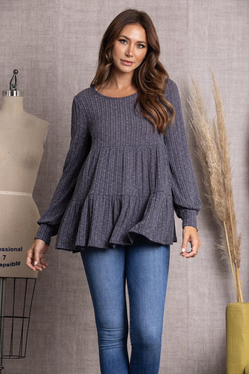 SAGE RUFFLED SHIRRING PEPLUM LONG SLEEVE TOP-T9288P