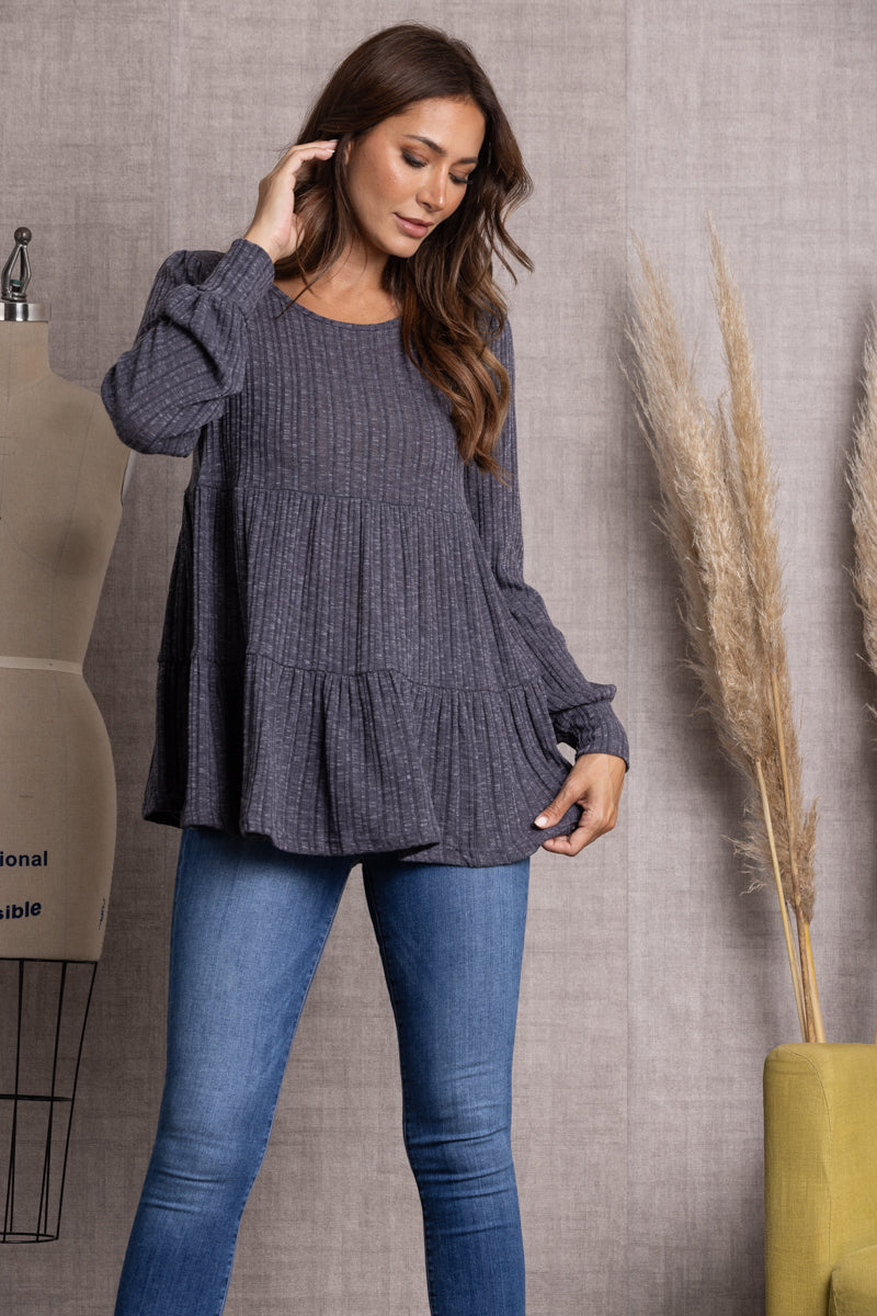 CHARCOAL V-NECK SOFT TOUCH RIB KNIT TOP FSLST3067
