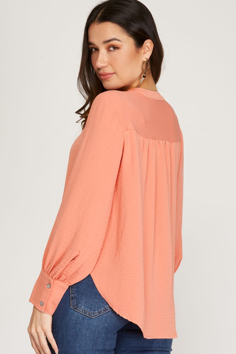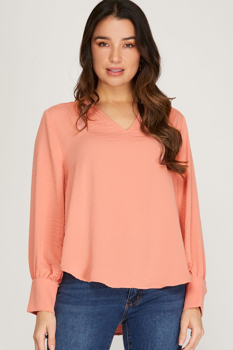 PEACH CORAL V-NECK LONG SLEEVES WOVEN BLOUSE TOP SKSS9975