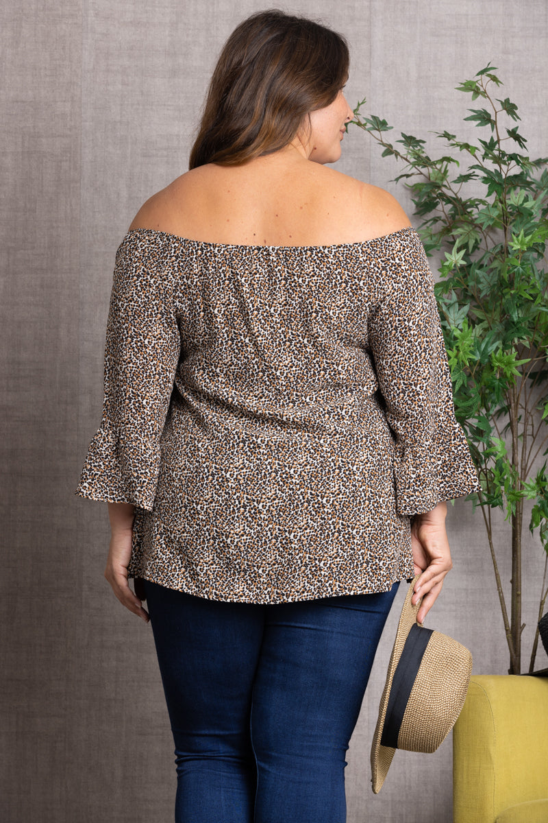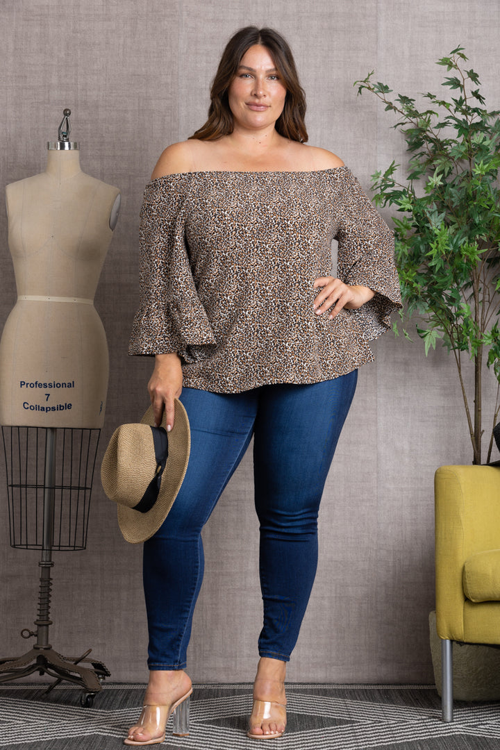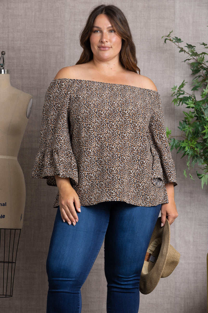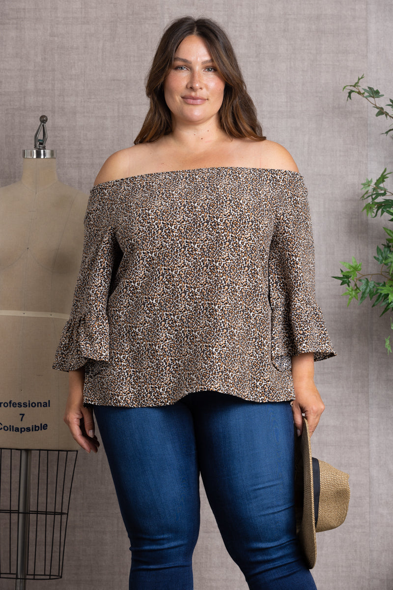 This ANIMAL PRINT OFF-THE-SHOULDER FLARED SLEEVE PLUS SIZE TOP from our collection adds a touch of sophistication to your wardrobe. Crafted from luxurious fabric, the top is designed to flatter your figure with its off-the-shoulder cut and flared sleeves, making it perfect for special occasions. Its bold animal print adds a hint of boldness to your look.