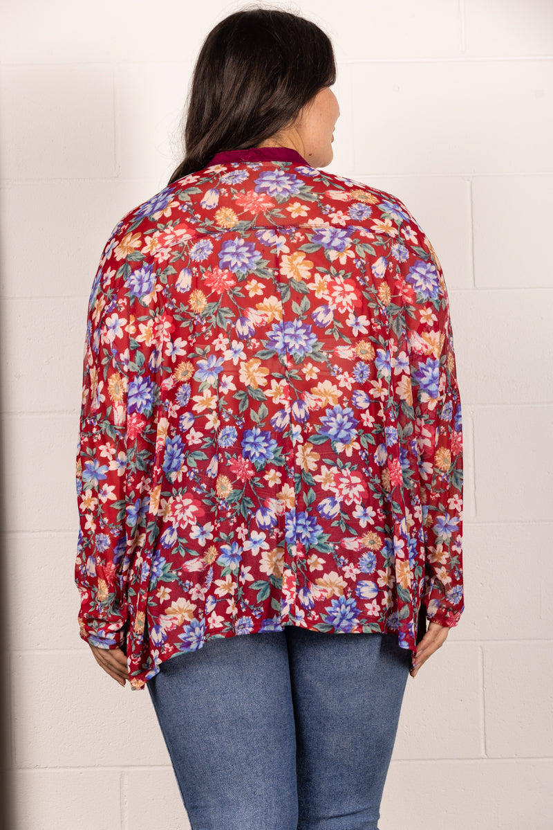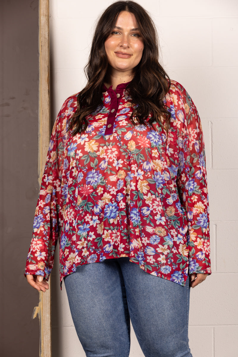 Elevate your style with our BURGANDY MANDARIN COLLAR FLORAL PRINT PLUS SIZE TOP! Featuring a flattering mandarin collar and a vibrant floral print, this top will make a statement while providing comfort and confidence. Upgrade your wardrobe with this must-have piece today!