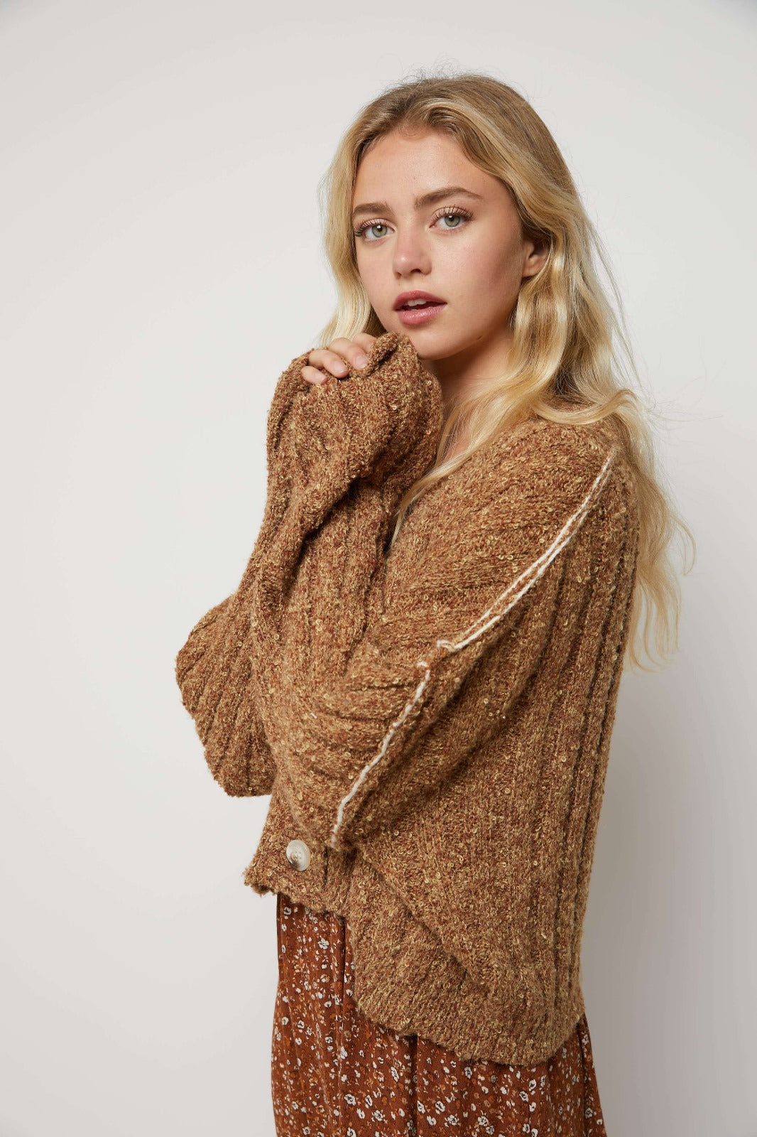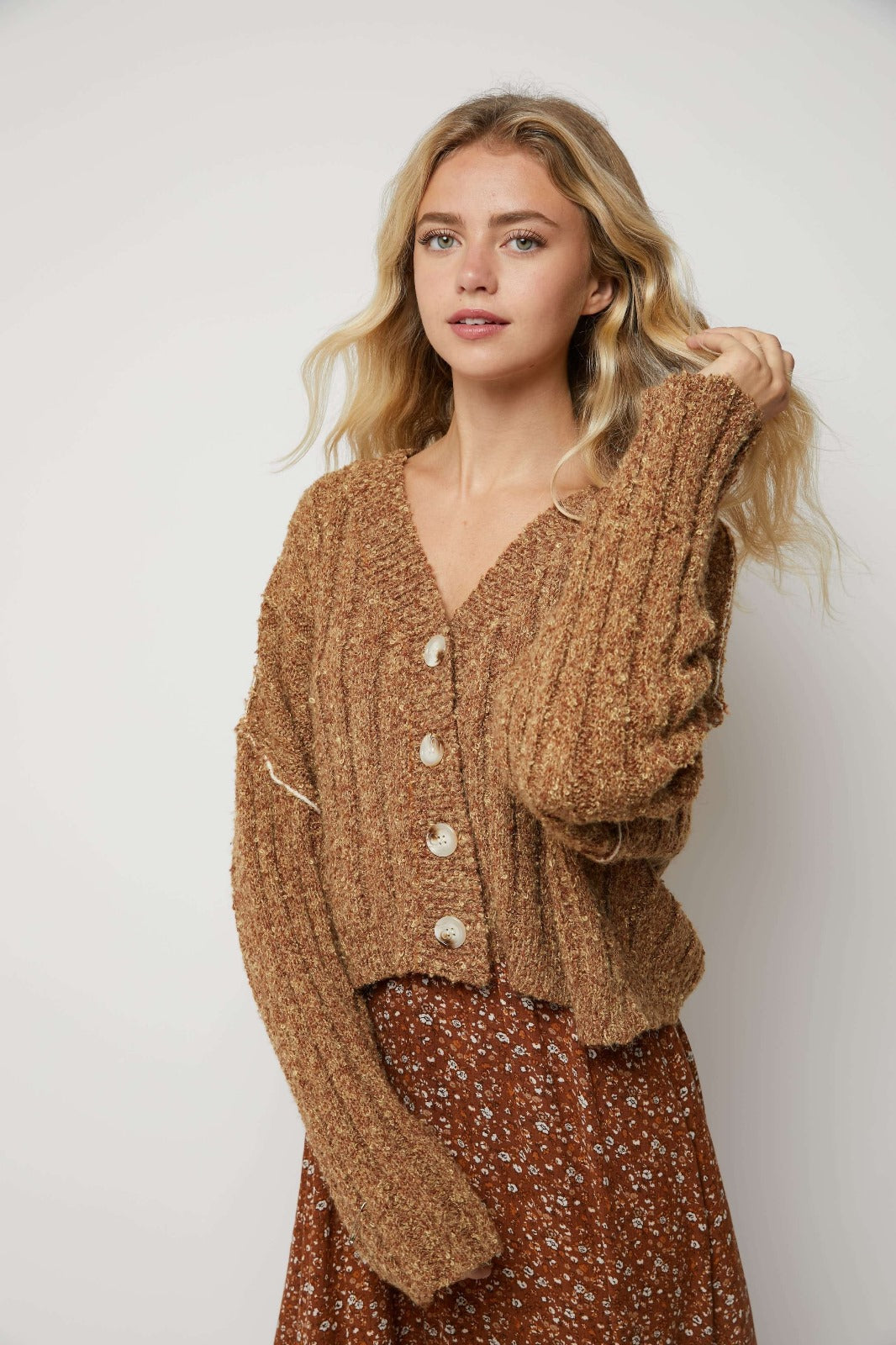 Stay cozy and stylish in our Camel V-Neck Fuzzy Button Front Crop Cardigan! Made with a soft and fuzzy material, this cardigan is perfect for chilly days. The v-neck and cropped length add a touch of modernity, while the button front allows for versatile styling options. Say "goodbye" to boring cardigans and "hello" to this quirky piece of outerwear!
