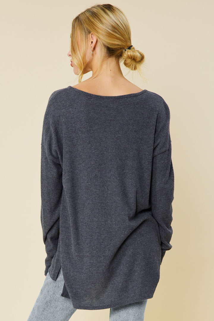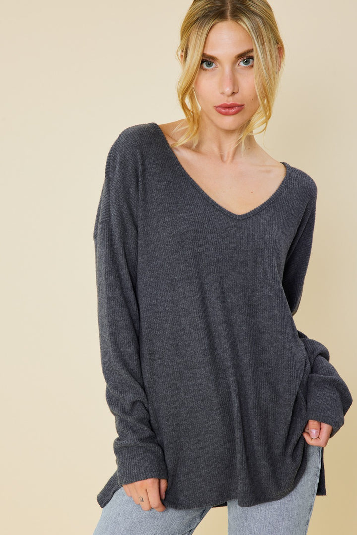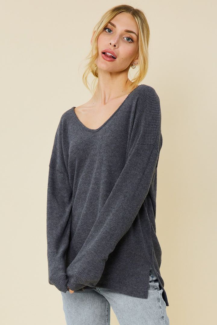 This soft-touch rib knit top in charcoal is the perfect blend of style and comfort. Loose fitting with a v-neck, it's great for any casual occasion. You'll want to wear it every day.
