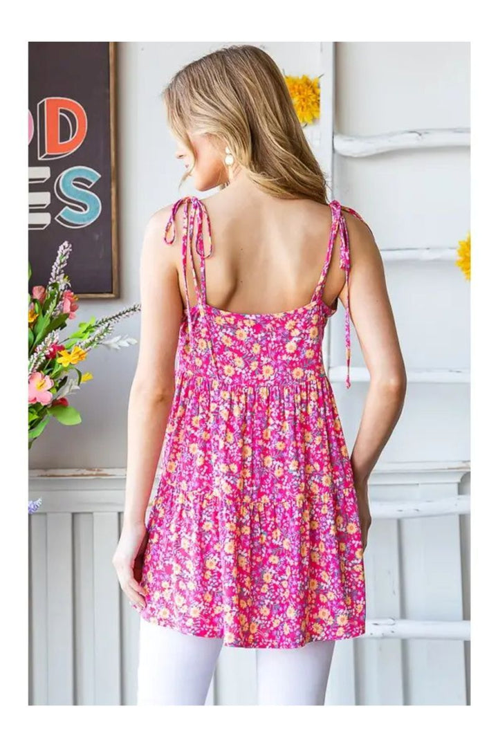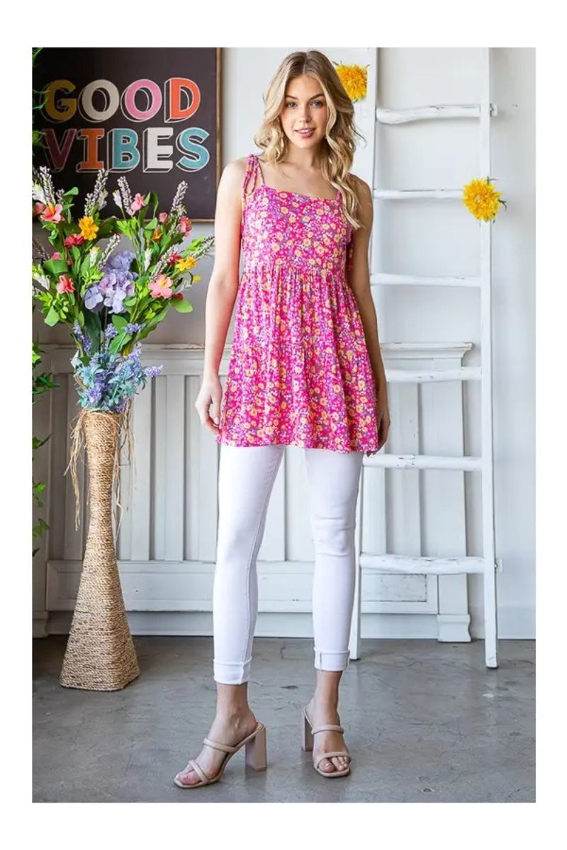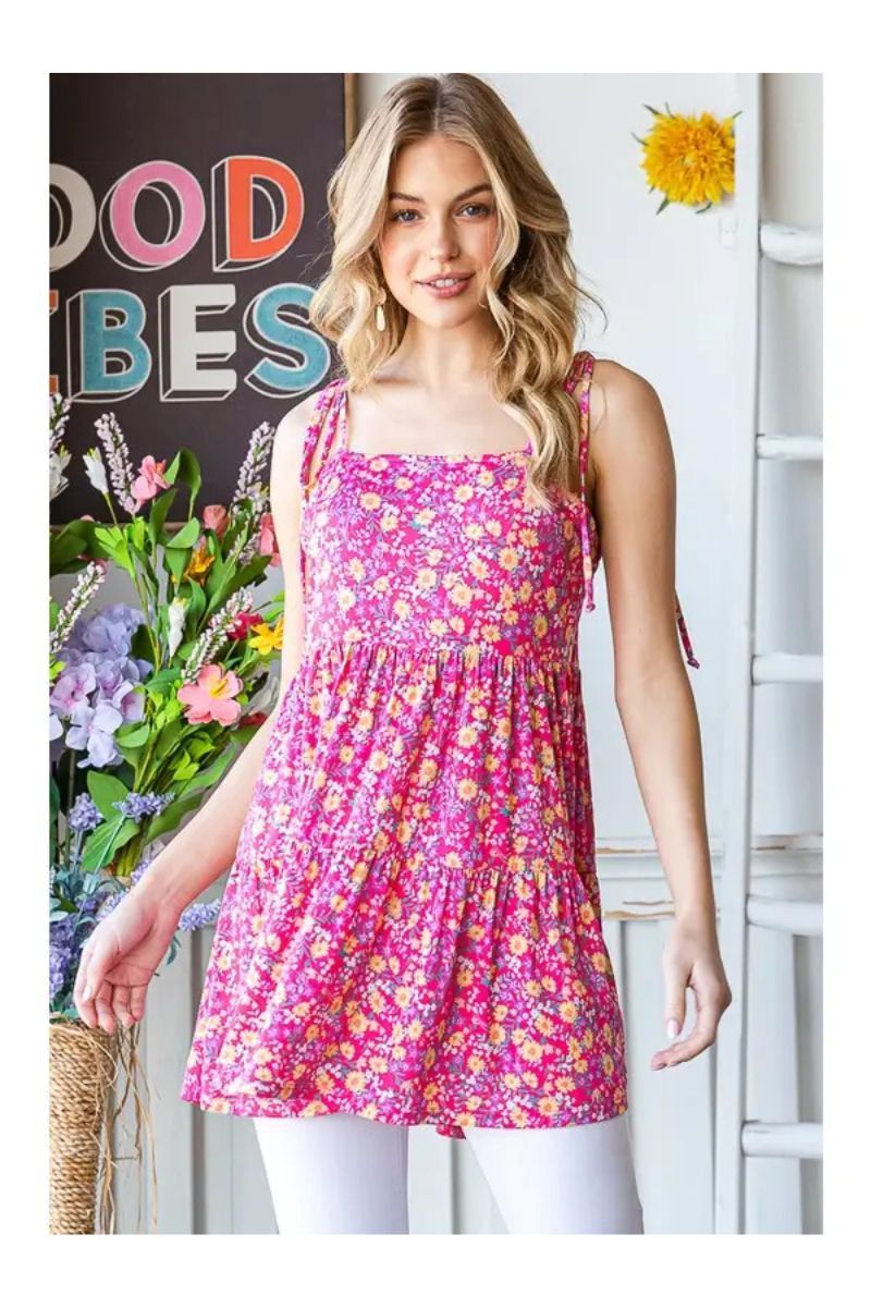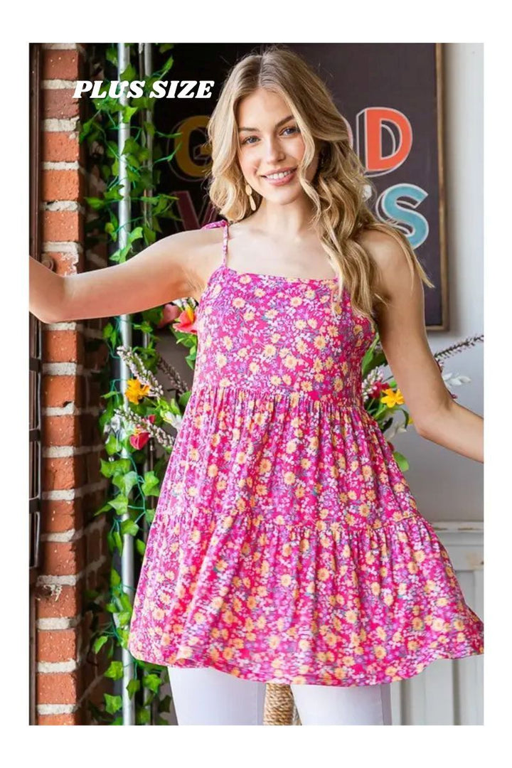 Brighten your wardrobe with this playful fuchsia floral print tiered tank, designed especially for plus sizes. Its flowing tiers add a fun, flirty flair while providing a comfortable, flattering fit. Perfect for sunny days or layering under your favorite jacket, this top brings vibrant style and easygoing charm to any outfit.