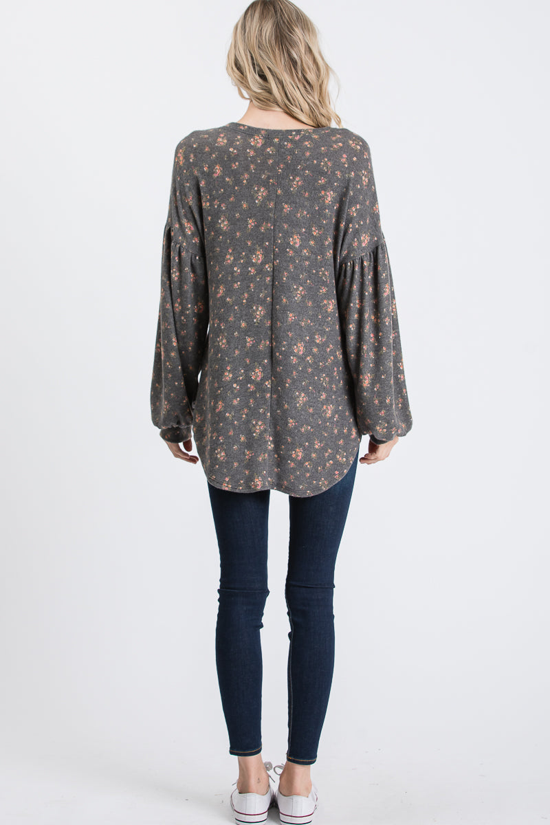 GREY FLORAL PRINT LONG SLEEVES KNIT TUNIC TOP SO3346T