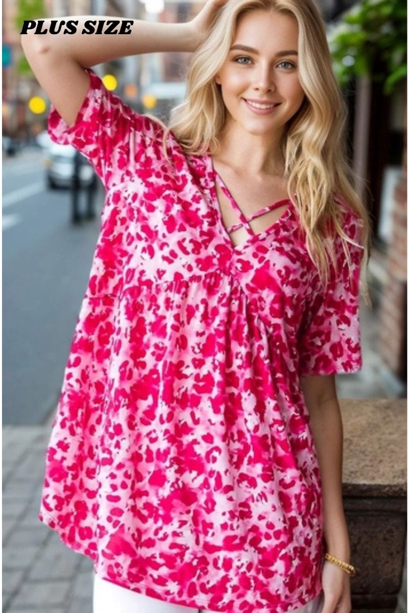 Turn heads with this hot pink criss-cross V-neck babydoll top, featuring a bold animal print designed to celebrate your curves. Its playful silhouette and plus-size fit offer both comfort and style, making it perfect for fun days out or casual nights. Embrace vibrant confidence with this standout piece that’s as lively as you are.