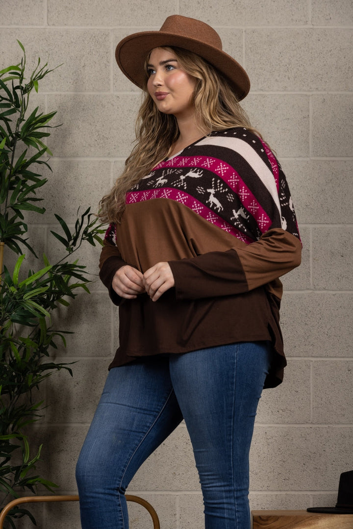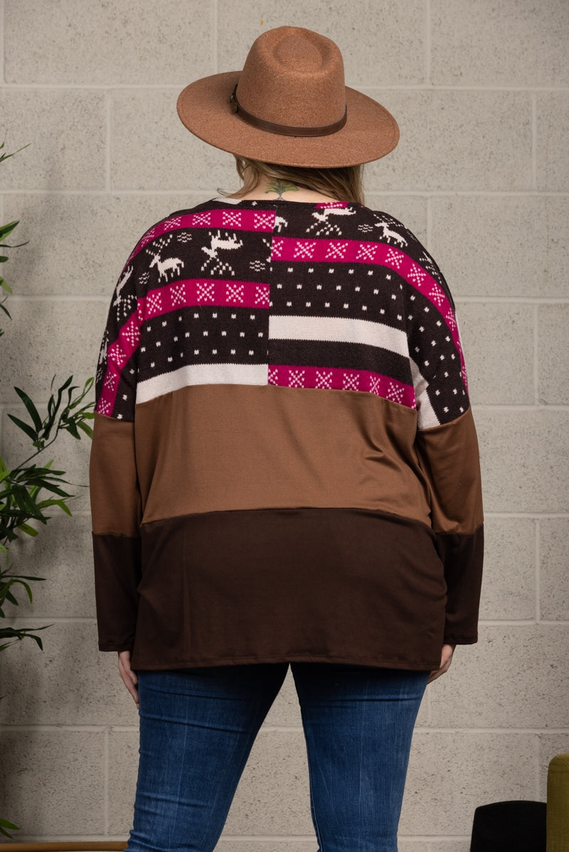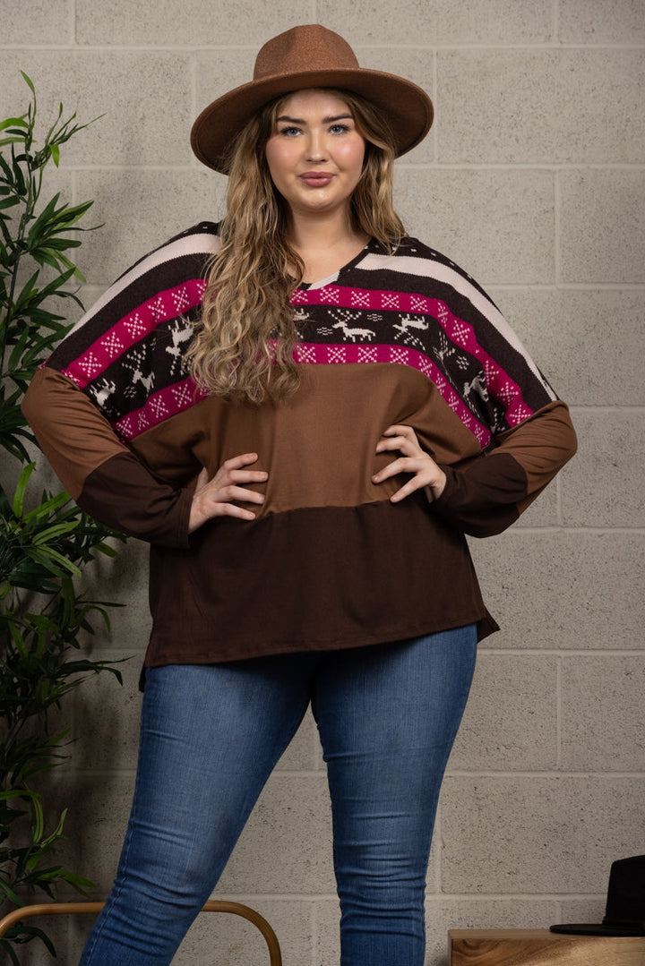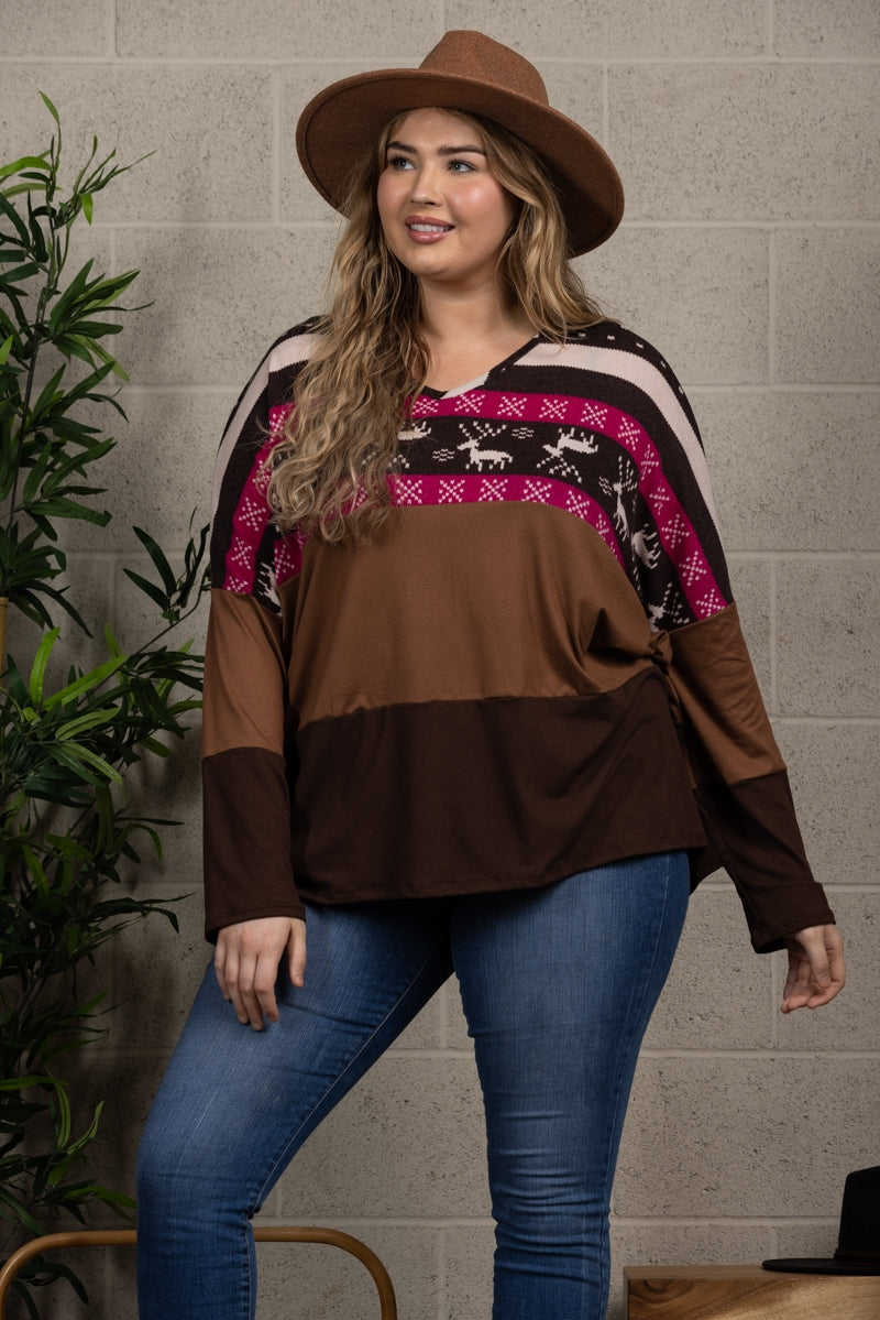 Unleash your wild side with this playful HICKORY BROWN CONTRAST KNIT TOP in a reindeer print, designed especially for plus size individuals. Express your unique style and stand out from the crowd with this quirky and fun top.