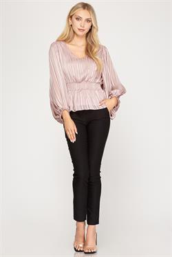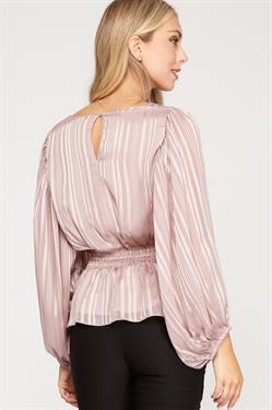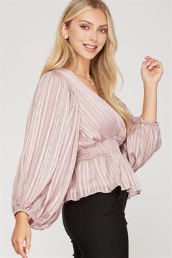 MISTY PINK STRIPED JACQUARD SMOCKED WOVEN TOP S5SS7908