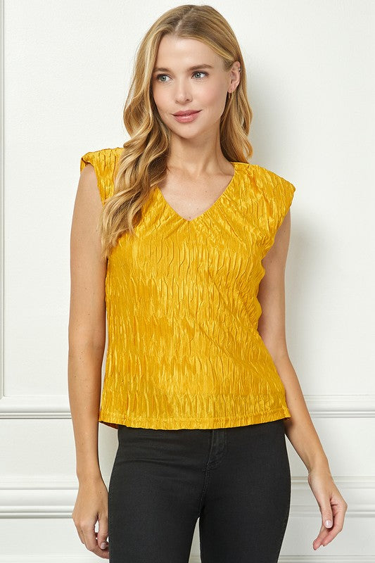 Add a pop of color to your wardrobe with this MUSTARD V-NECK SLEEVELESS PAD TEXTURED TOP. The V-neck adds a touch of elegance while the textured fabric adds dimension to your outfit. Stay stylish and comfortable with the padded shoulders.