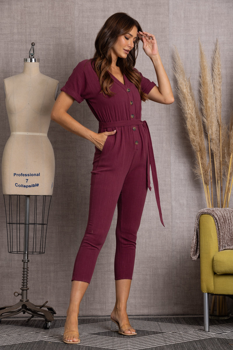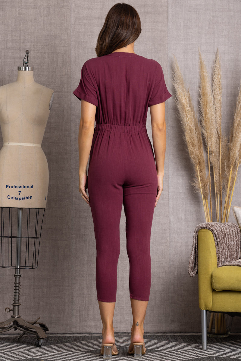 Turn heads in this ethereal PLUM V-NECK SHORT SLEEVES W/SLASH JUMPSUITS. Featuring an alluring v-neckline, fluttering short sleeves, and subtle slash detail, it's perfect for making an entrance. Rock this show-stopping jumpsuit and command attention!