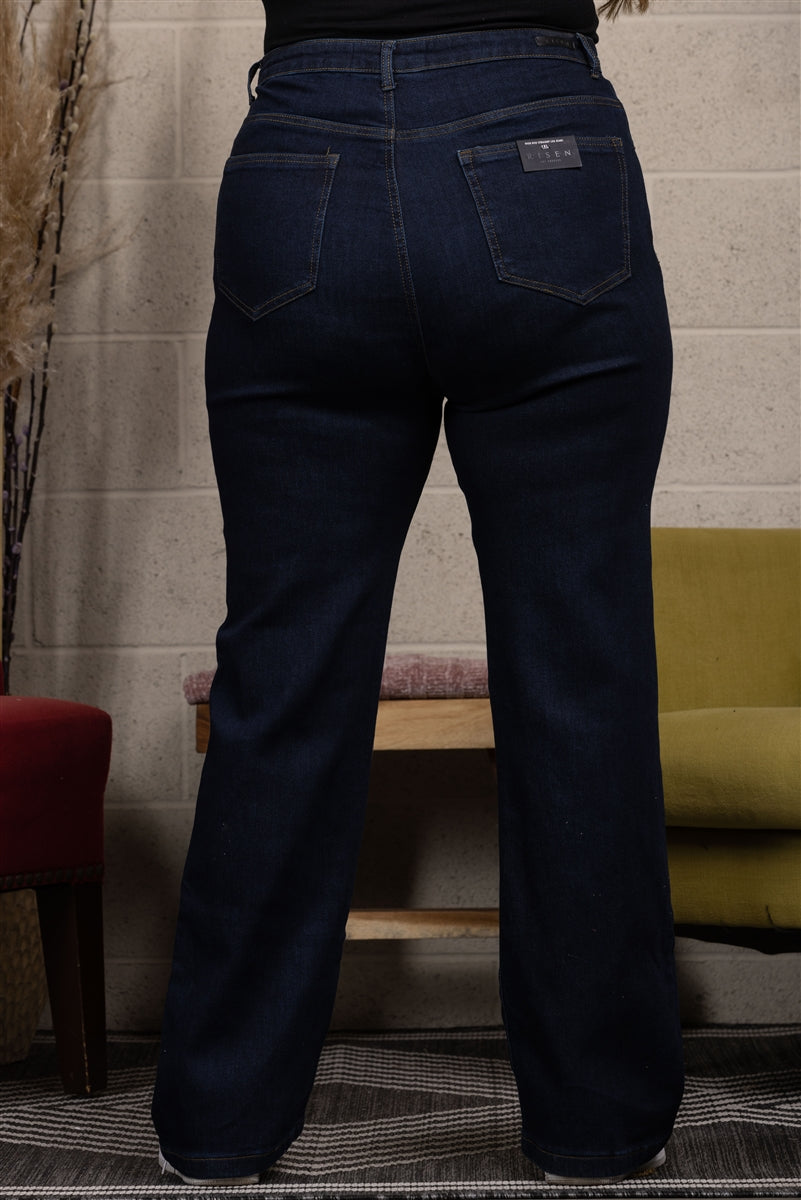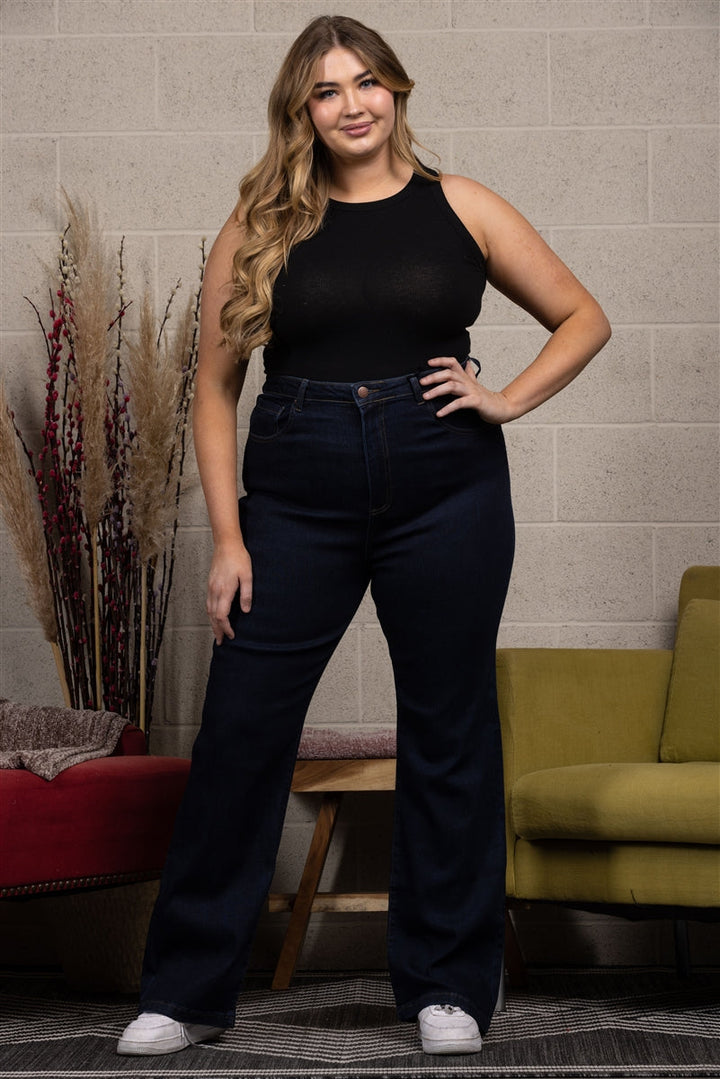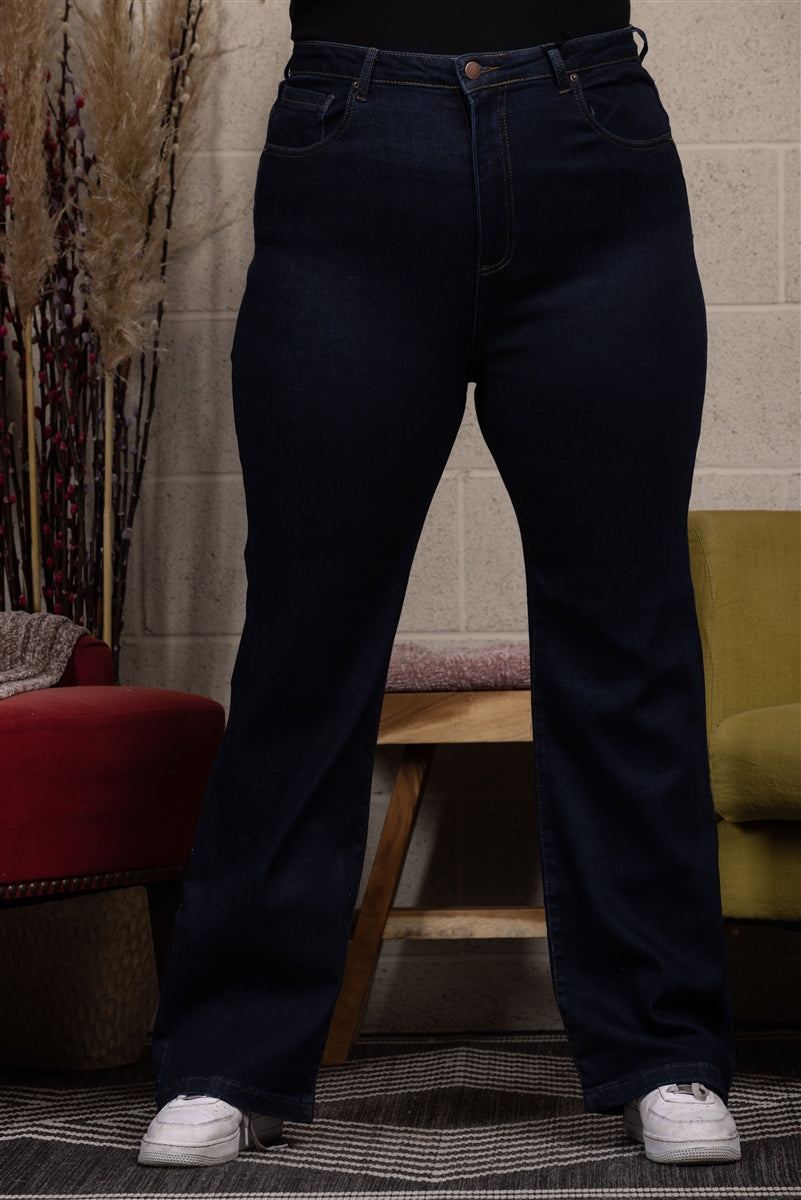 Upgrade your denim game with these dark blue high-waisted, wide-leg jeans. Designed for plus-size figures, these jeans provide a flattering fit while also offering comfort and style. Perfect for any occasion, these jeans will be your new go-to for a stylish and playful look.