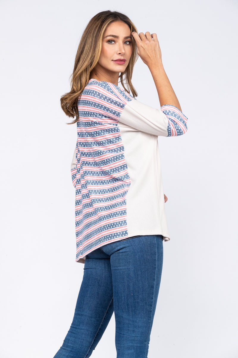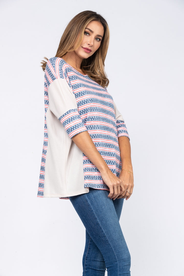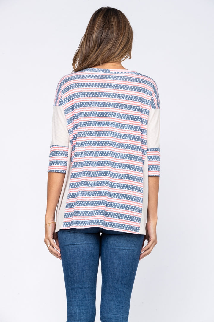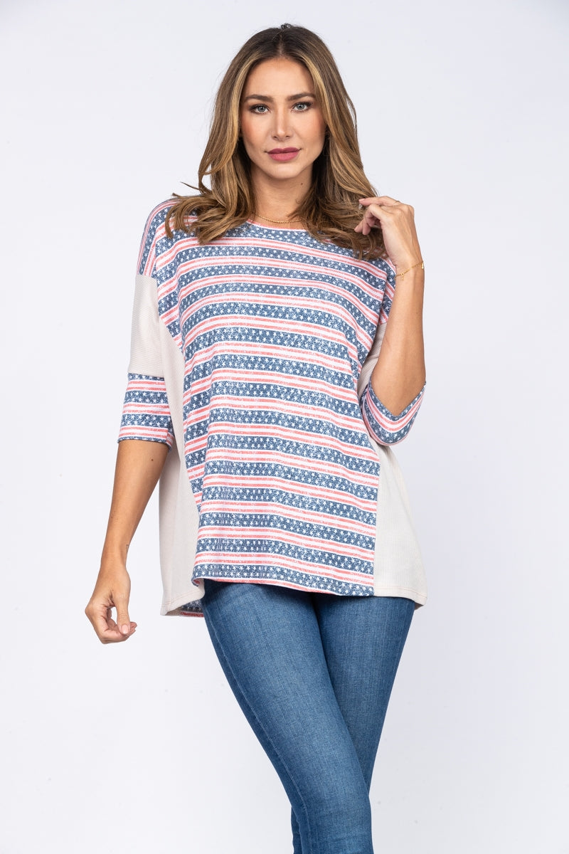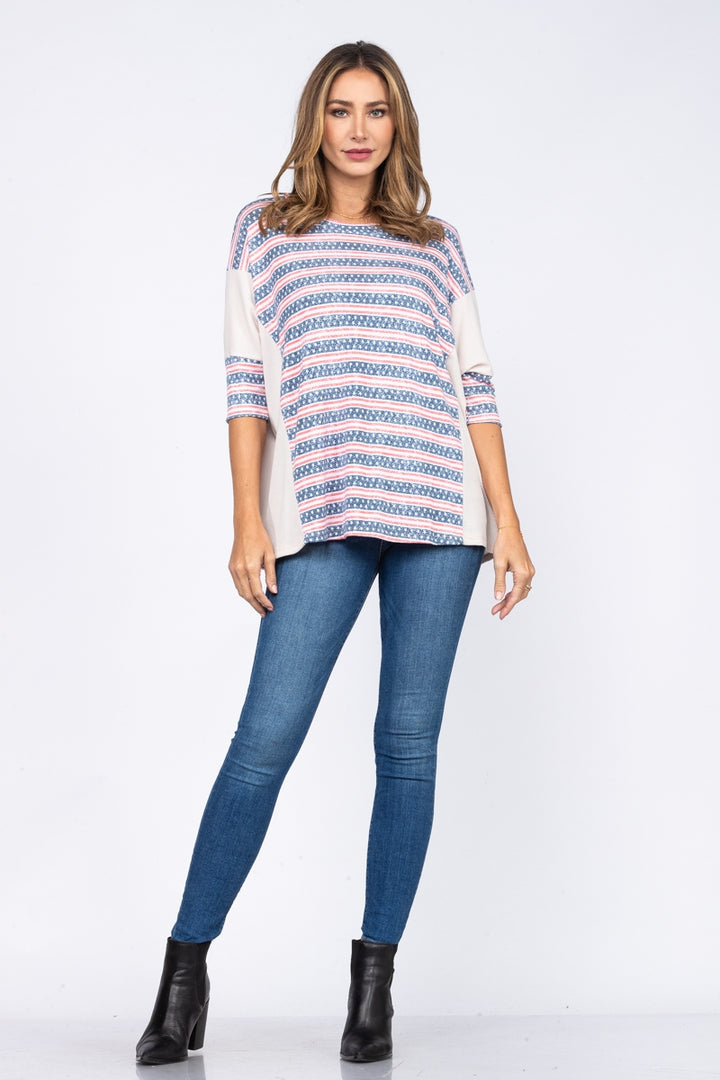 This top is out of this world! Its oatmeal stars print and contrast knit add a playful touch to your outfit, while keeping you cozy and stylish. Perfect for any casual occasion.