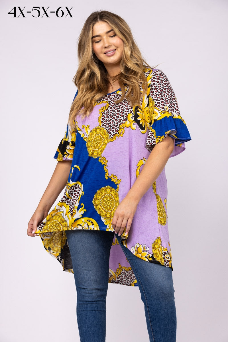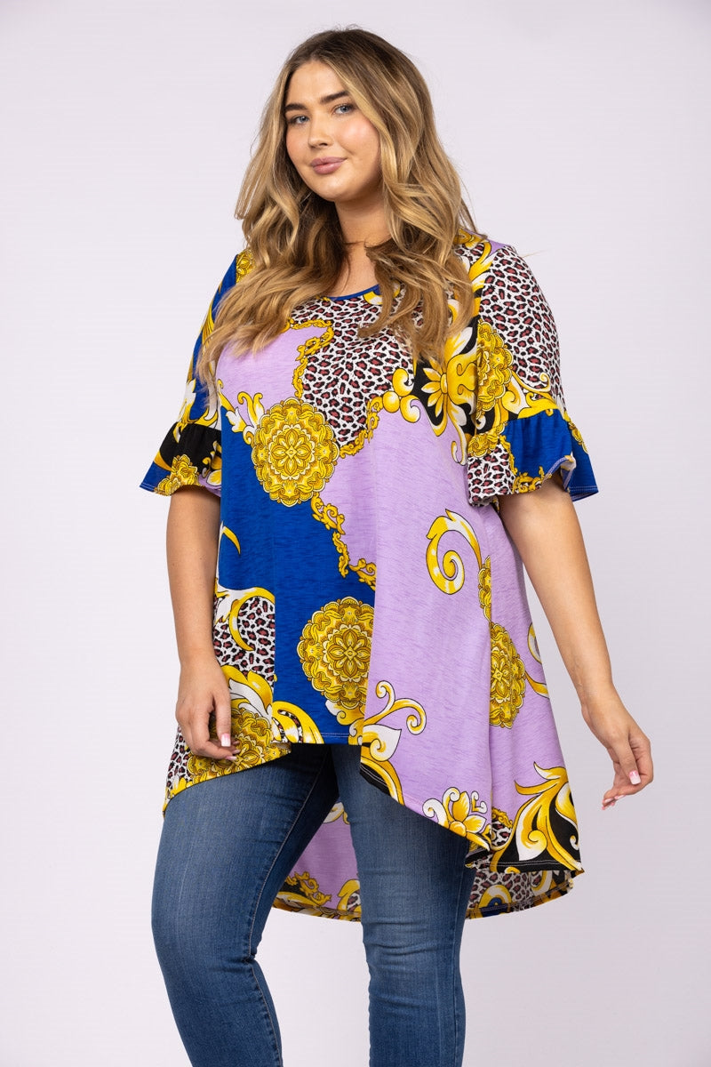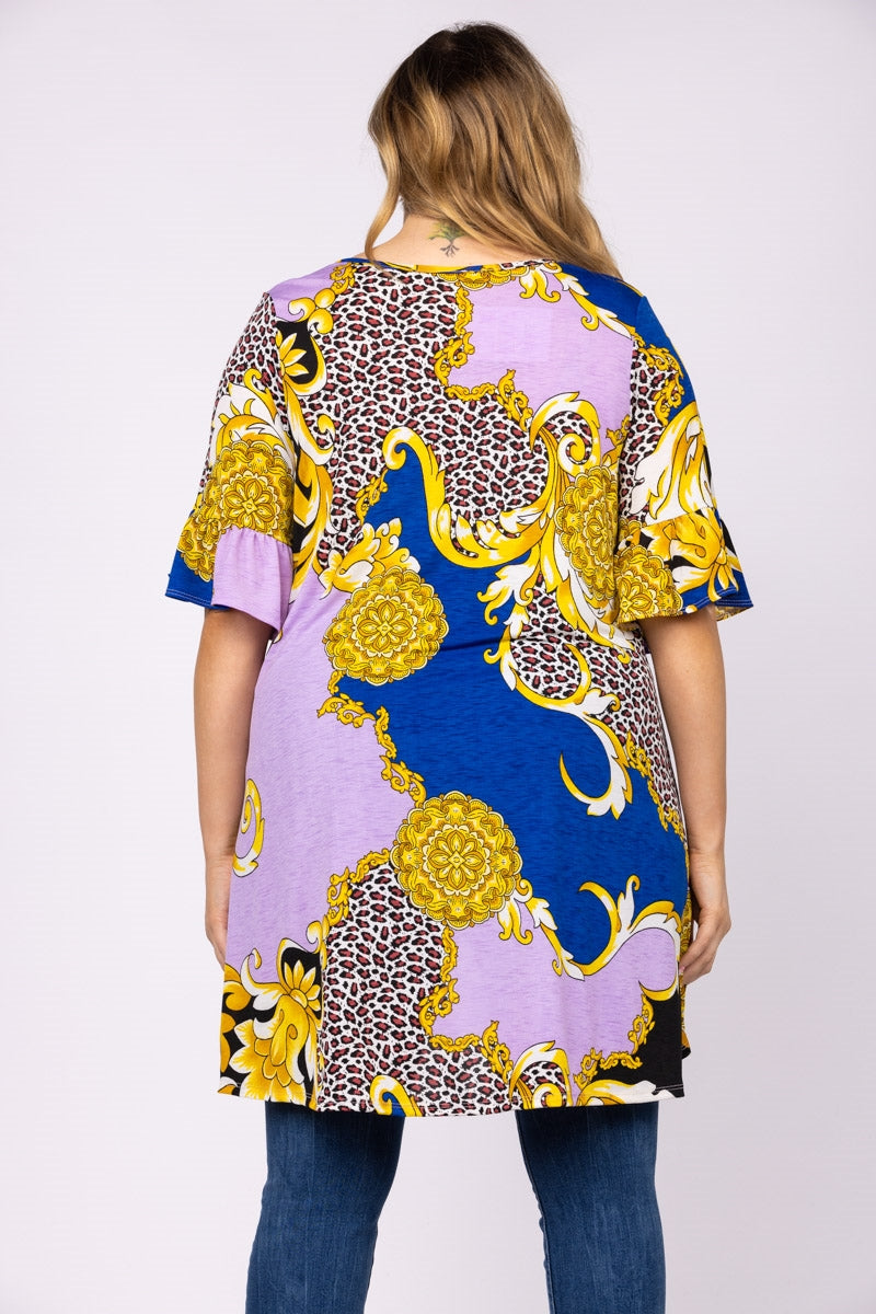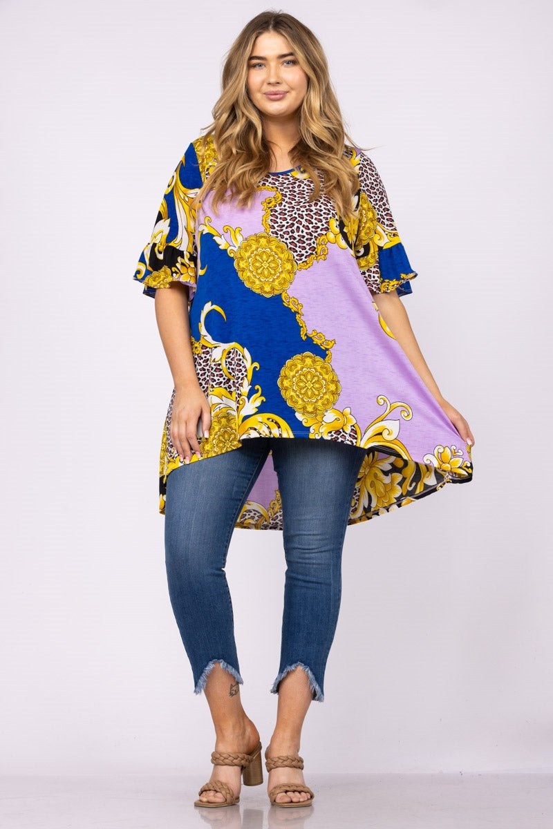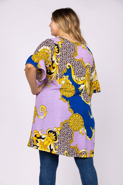 Unleash your bold style with our GOLD & PURPLE MULTI PRINT LONG BACK PLUS SIZE TUNIC TOP! Perfect for risk-takers who love to stand out, this tunic top features a unique gold and purple print and a longer back for added flair. Show off your adventurous spirit with this must-have piece!