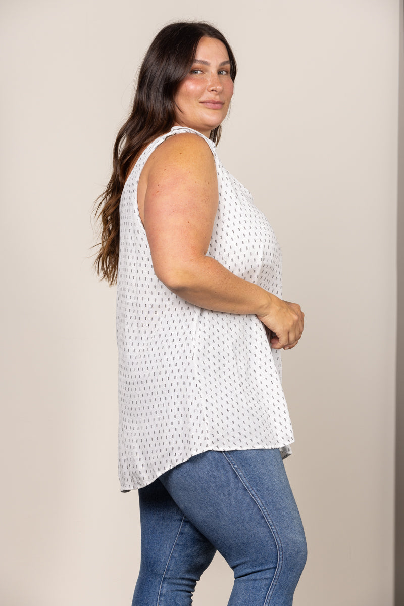 Experience the perfect blend of style and comfort with our White Arrow Head Self-Tie Sleeveless Plus Size Top! Featuring a trendy arrow head print and a self-tie design, this top effortlessly elevates your look while providing a flattering fit for all sizes. Make a bold statement and feel confident in our premium quality top.