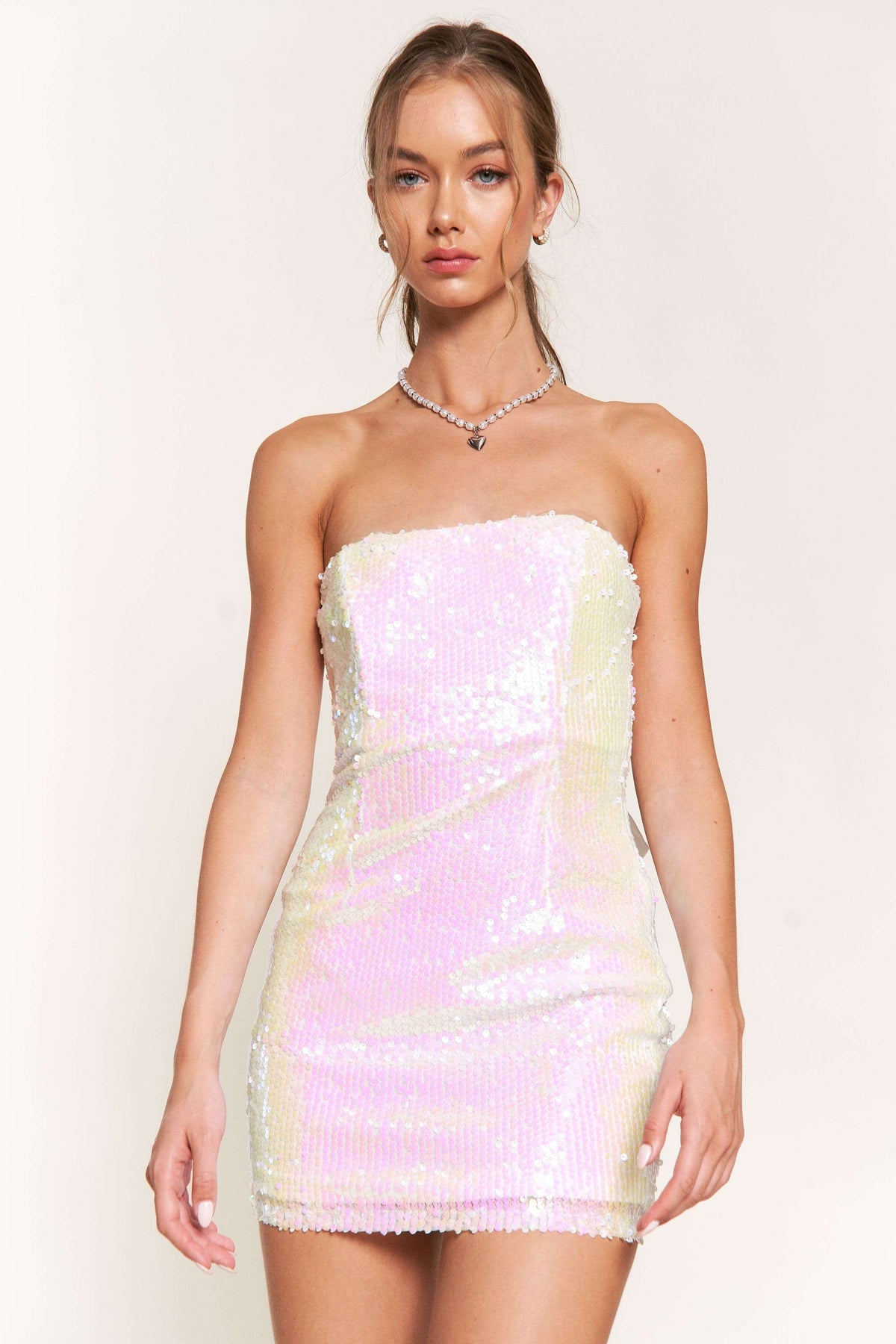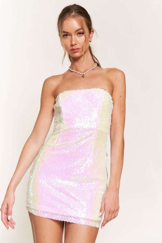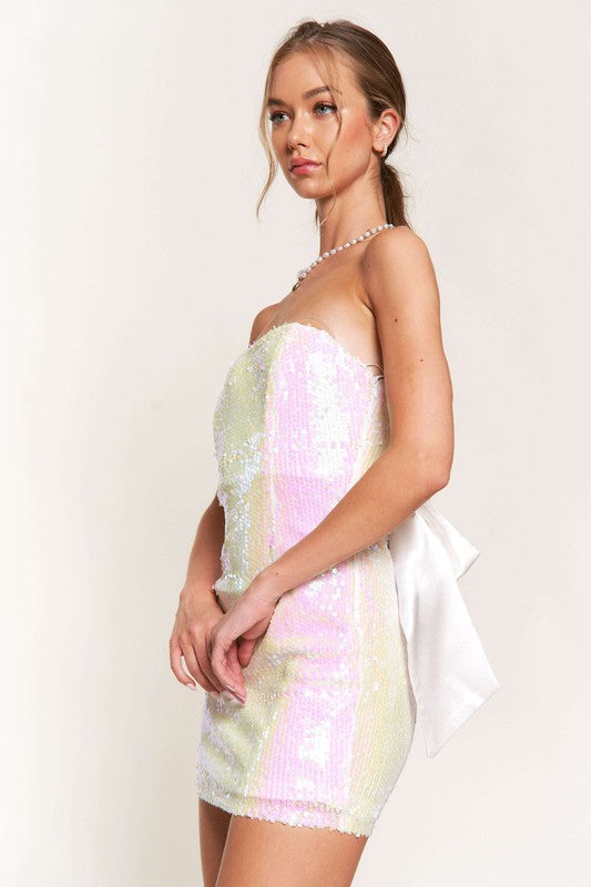Be the belle of the ball in our White Sequin Bow Back Detailed Sleeveless Mini Dress! Shimmer and shine in this adorable dress featuring a fun bow-back detail. Perfect for any special occasion, this dress will have you dancing the night away with confidence and style. Who needs a glass slipper when you have this dress!
