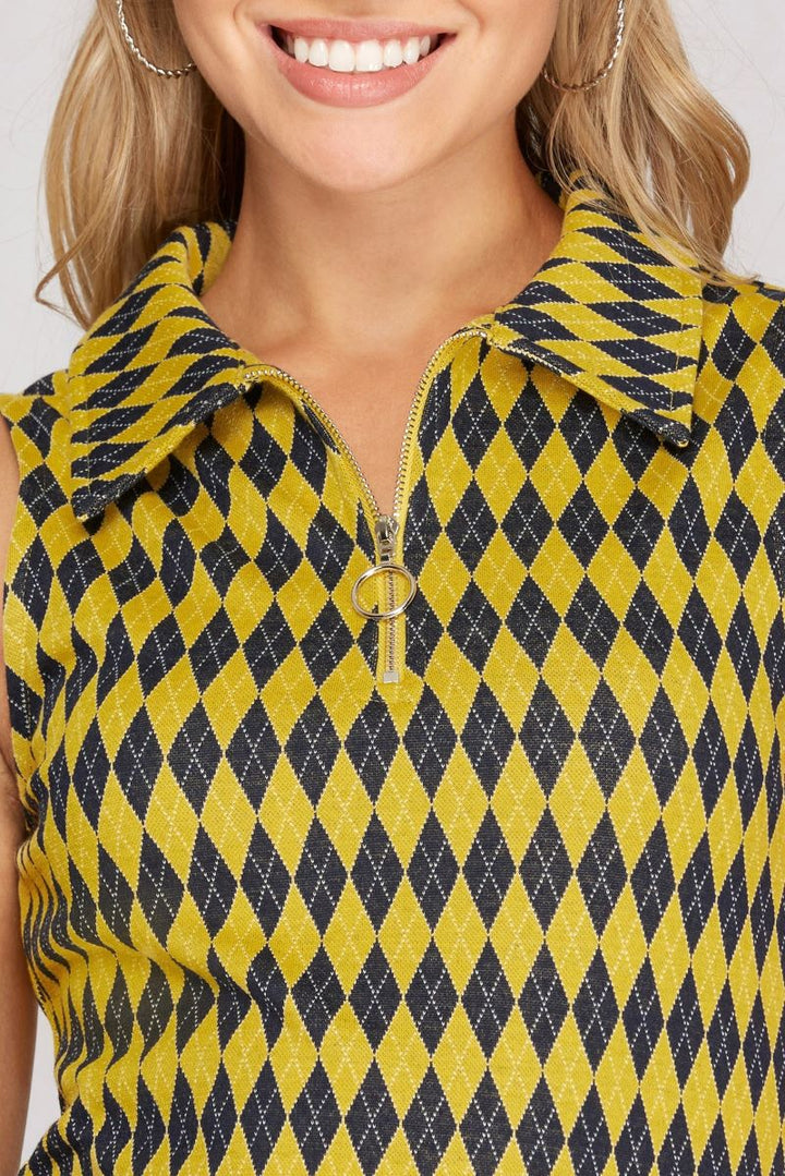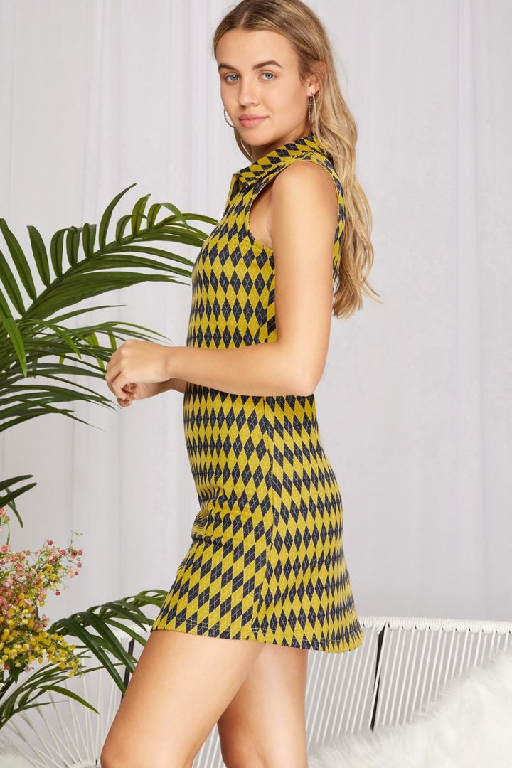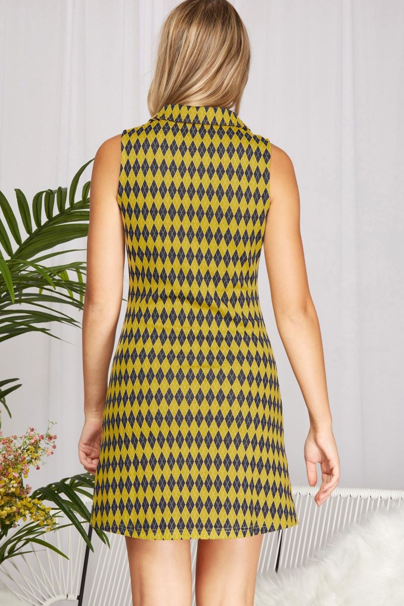 Brighten up your wardrobe with this fun and flirty YELLOW SLEEVELESS JACQUARD ZIP-UP KNIT MINI DRESS. Featuring a playful jacquard pattern and a trendy zip-up design, this dress is perfect for any occasion. Stay stylish and comfortable all day long!